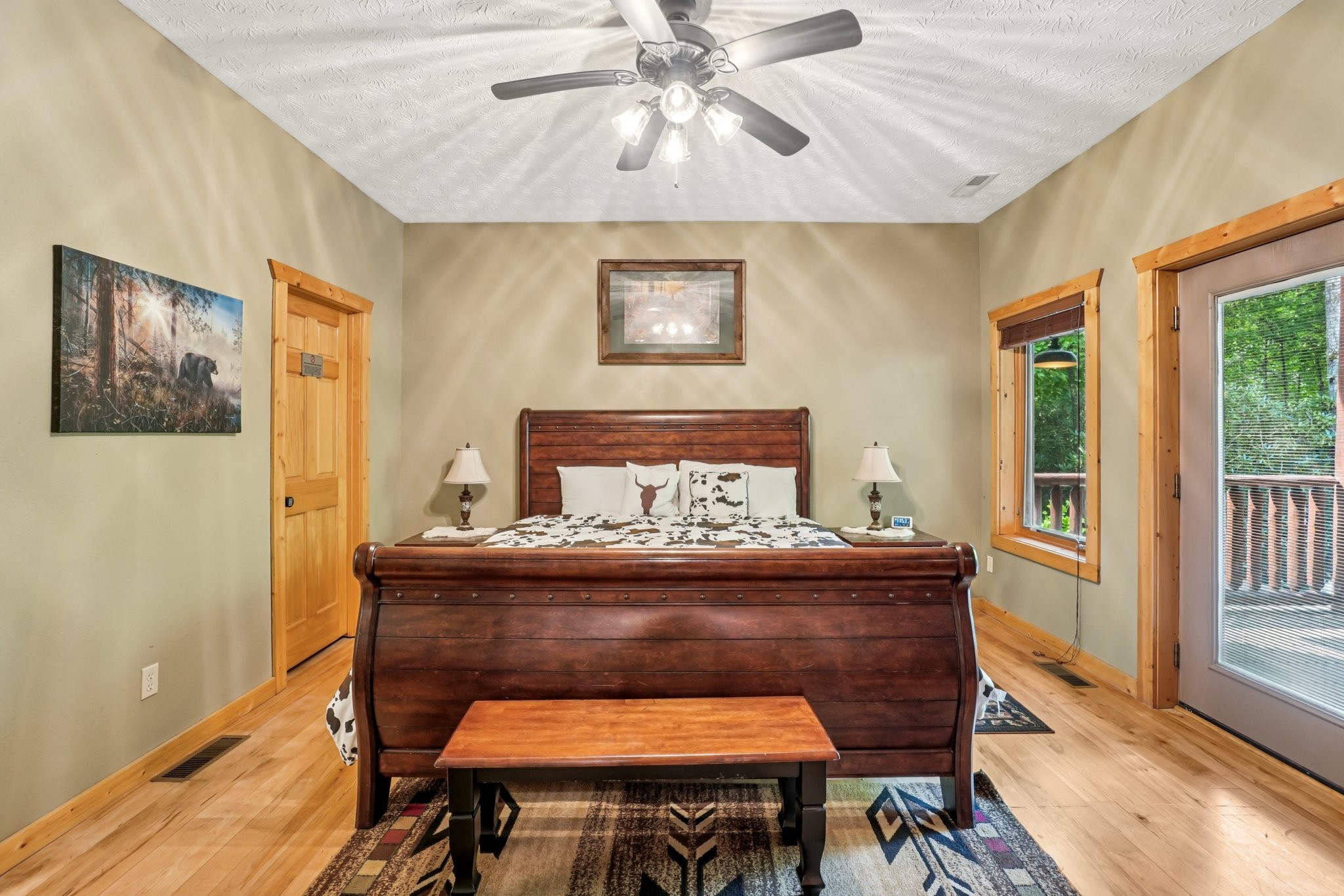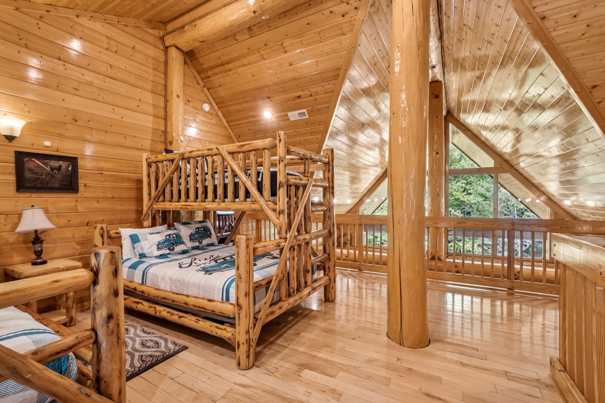 Upstairs you'll find two large en-suite bedrooms and a flexible loft area. The lower level is made for fun, complete with a large game room, second stone fireplace, pool table, Foosball, arcade games, and additional living space. Two more en-suite bedrooms, a bunk room with log beds, and four portable memory foam beds comfortably accommodate large groups. Each lower-level bedroom opens to its own private deck.