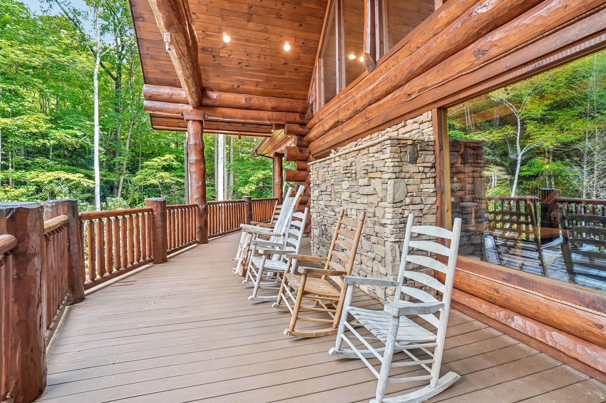 The main level features soaring vaulted ceilings, a dramatic stacked stone fireplace, and massive picture windows that frame peaceful forest views and a serene mountain stream. A chef’s kitchen includes custom hickory cabinets, high-end appliances, and a 14-foot log dining table. The spacious great room with four oversized sofas is ideal for entertaining. The primary suite offers a spa-like en-suite bath and walk-in closet. Step outside to the wraparound deck with outdoor dining, a hot tub, and wooded views.